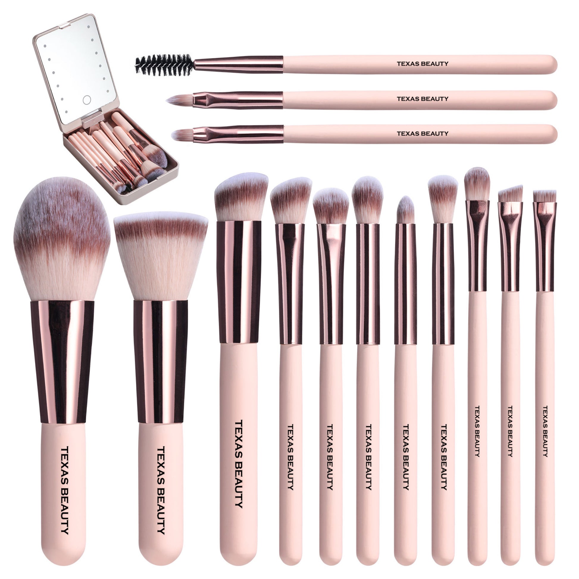 14 Pcs Pink Brush set with Led Light Mirror